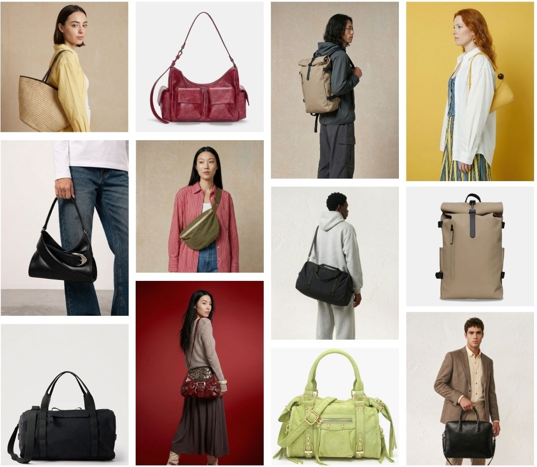Veeton can generate an AI photoshoot for any kind of bag. It can generate AI photoshoots for handbags, backpacks, crossbody bags, tote bags, travel bags, and more. It also works across all materials: leather, faux leather, suede, denim, canvas, velvet, and any other texture your collection features. Whatever the shape, size, or finish, the platform adapts to your product to generate a realistic ecommerce photoshoot with AI.