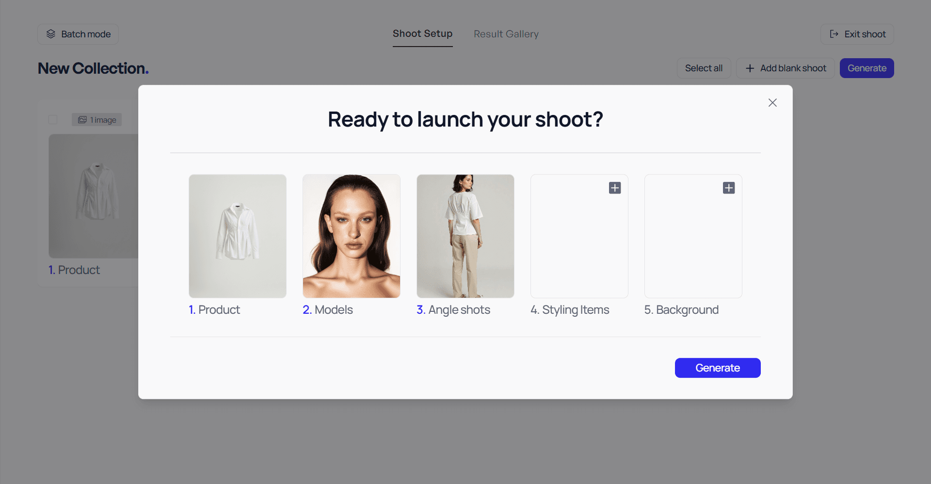 To generate new AI fashion photos, you need to launch a new shoot: