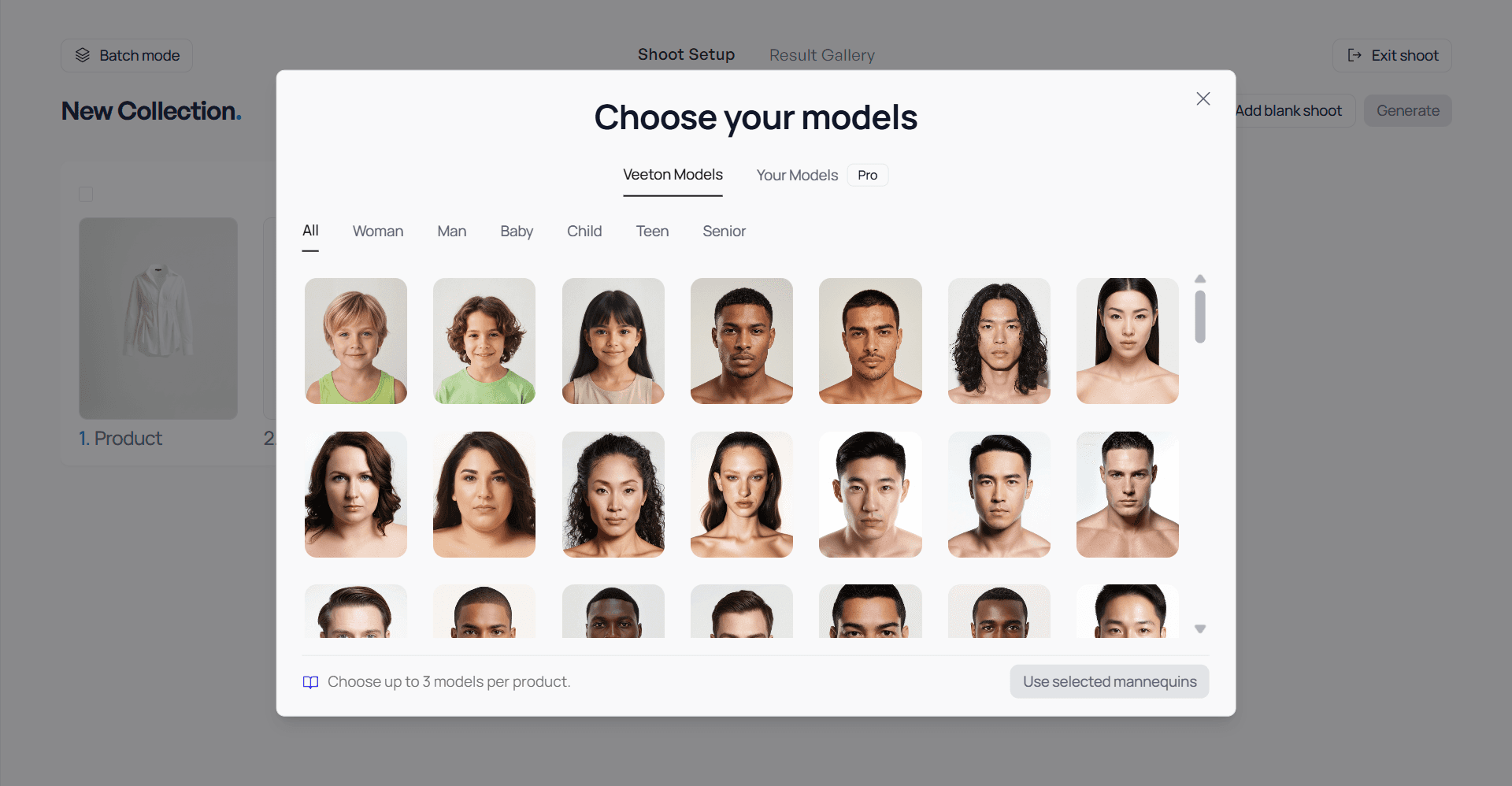 Once you’ve selected your main SKU, you can now choose the model who will wear the outfit (Woman, Man, Baby, Child, or Senior).