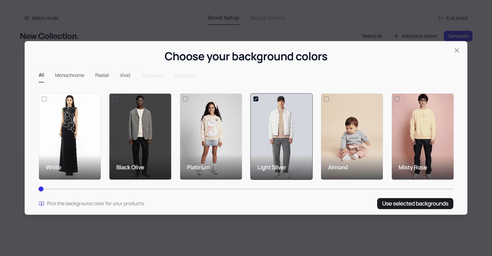 Then select a background (Monochrome, Pastel, Vivid) — or let AI do it for you.