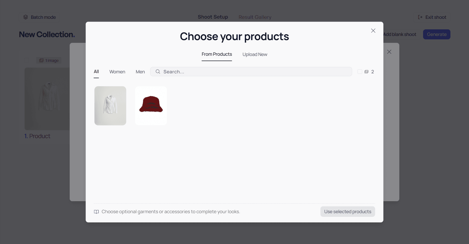 Choose products you've already uploaded to your gallery or upload a new product —or let AI do it for you if the outfit needs to be completed.